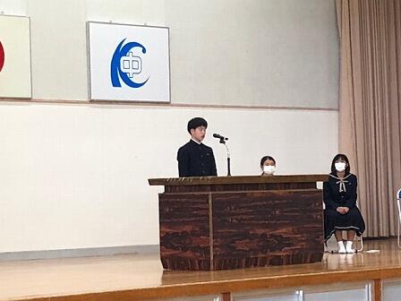 式の最後に、約1年間、校歌の伴奏と指揮を務めた3年生からあいさつがあり、みんなで労いました。