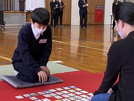 1月5日(水)、「くしま学かるた大会」が、串間中学校体育館にて2年振りに行われました。市内の小中高校生代表32名が出場。串間中学校からは予選を勝ち抜いた1年生6名が、串間市の特産物、観光地、著名な方々を作品にした、かるたに手を伸ばしていました。児童、生徒の保護者や各学校の先生方が見守る中、ピーンとした緊張感が張り詰め、詠み手の先生の声に耳を傾けて、相手より1秒でも、1枚でも多くの札を取っていました。 優勝は串間中1年3組の作本陽乃さん、3位に比嘉穂乃花さんも入賞しました。