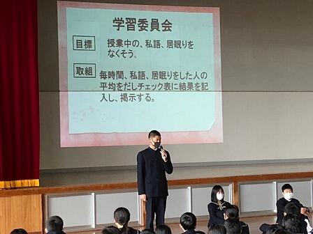 新年最初の生徒集会の様子です。各委員会新年に相応しい取組を計画していました。新執行部をはじめ、新生徒会役員の活躍が楽しみです。