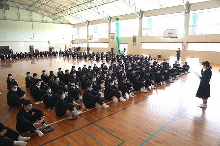26日、修了式に先立ち、串間市社会福祉協議会より本校に感謝状に贈呈がありました。コロナ禍の今年度、生徒会が中心となった「手作りマスク」「シトラスリボン運動」「コロナに負けない宣言」などの取組が評価されました。令和3年度も今年度以上に、「チーム串間」として生徒、教職員が一つになって串間市を盛り上げてまいります。