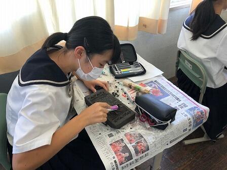 10日、1年生の「総合的な学習の時間」の様子です。「道の駅」くしまの敷地内に建設中のイベント広場の柱に使われることになっているレンガに彫刻を施しました。生徒たちは思い思いの言葉を書いた下書きの紙をレンガに張り、彫刻刀や竹の串などを使ってていねいに彫っていきました。