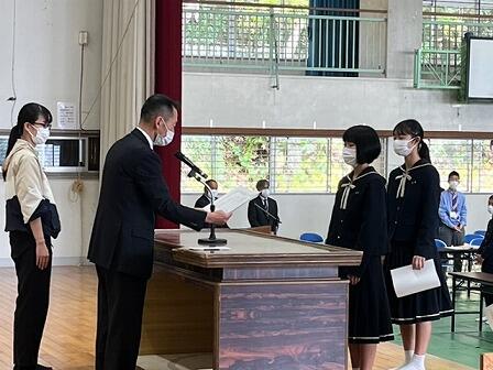 明日16日(水)は本校の第5回卒業式です。今日は全校生徒で予行練習と、皆勤賞の生徒の表彰を行いました。最後には今年度で退職される校長先生の卒業式も・・・