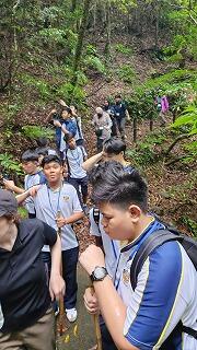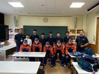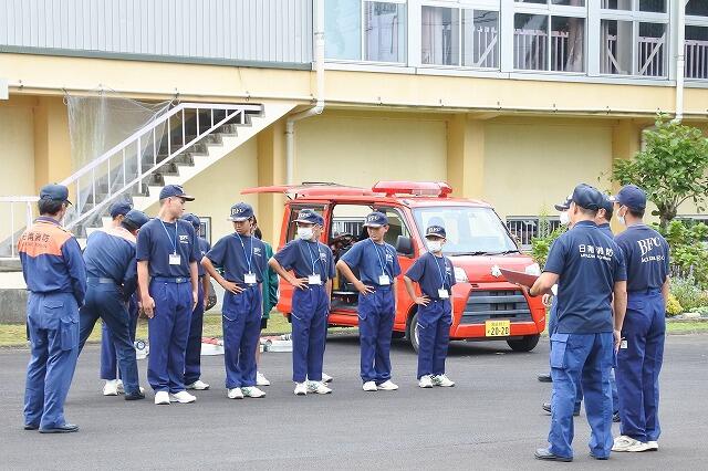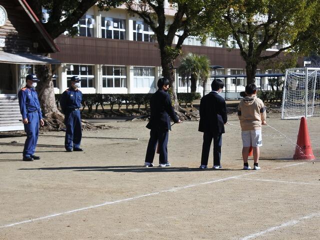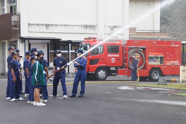本年度は、8年生2名と7年生8名で活動しています。これまでに、AEDによる救急法訓練や、防災航空センターの施設見学などを行いました。そして今回は、来年の1月に飫肥の河川敷で実施される消防出初め式に向けて、訓練礼式の練習と放水体験を行いました。これからも出初め式のための消防訓練が続く予定です。