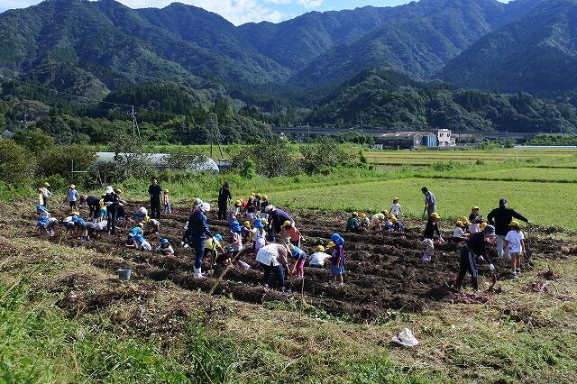 春先に植えた芋の苗が順調に育ち、例年より1週間以上早い収穫日となりました。本日の収穫にも、JAの青年部の方々にご協力をお願いし、1、2年生とこども園のぞう組さんが総出で、大きく育った芋を掘り起こしていました。