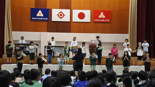 4年生から9年生が参加して学習発表会を実施しました。ステージ発表では、4年生が合奏し、5年生から9年生は合唱コンクールでした。また、7年生が総合の時間に地域の方々から指導していただいた伝統芸能(清流太鼓・棒踊り・獅子舞)の練習の成果を発表しました。最後は吹奏楽部の演奏でしたが、9年生の女子生徒が演奏に合わせたダンスを披露し、盛り上げてくれました。