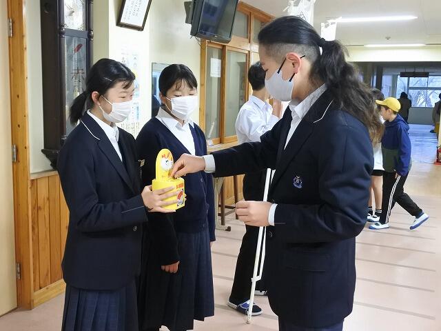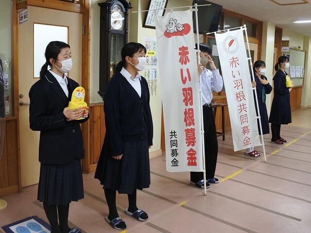 生徒会が中心となって、今日から1週間、赤い羽根共同募金活動が始まりました。先週の集会では、生徒会がこの活動についてのプレゼンを行って、協力を呼びかけました。本日は、早速、登校してきた児童生徒が募金をしていました。募金をしてくれたお礼に、生徒会もささやかな景品を準備していました。