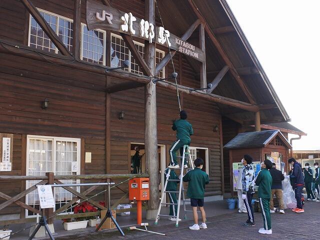 北郷町まちづくり協議会の北郷駅清掃活動に、本校の生徒29名もボランティアで参加しました。生徒たちは、男女で分かれて、長竿の竹笹を使って天井のすす払いをしたり、ライトや窓ガラスを磨いたり、トイレの清掃やプランターづくりなどに熱心に取り組んでくれました。2時間ほどの活動で、駅構内はすっかり綺麗になり、年末年始の帰省客や観光客を迎える準備が整いました。