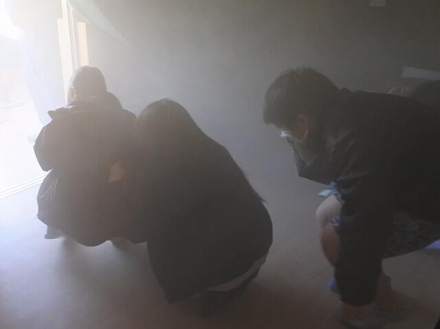 理科室で火災が発生したとの想定で、避難訓練を実施しました。訓練ではまず、5・7年生が煙体験を行い、煙の中での避難の仕方や注意点を学びました。その後、火災報知器の合図で全校児童・生徒がグラウンドに避難しました。避難後は、北郷消防署の隊員の方より、消火器の使い方を学びました。