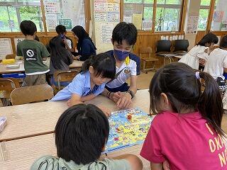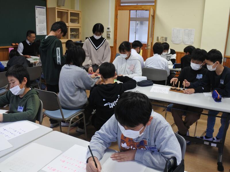 本年度も、宮崎大学より大学生等を講師として派遣していただき、算数・数学エンタを開催しました。今回は4つの教室に、合計29のブース(企画)を準備していただきました。5年生から9年生の児童生徒は、数名のグループで各教室を回り、ゲームやパズルを解いたり、探究的な課題にチャレンジしました。どのブースでも、児童生徒が熱心に大学生等の説明に聞き入って、問題解決に取り組んでいました。