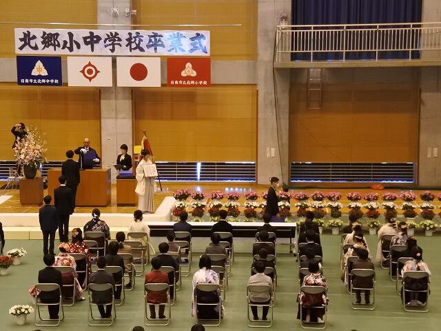 教育委員の別府様や学校運営協議会の委員の方々にご臨席いただき、第15回となる小中合同の卒業証書授与式を執り行いました。まず、6年生38名と9年生23名の一人一人に、学校長から卒業証書が授与されました。その後、送辞・答辞や卒業生の歌など、コロナ禍前の内容に戻すことができ、つつがなく厳かな式とすることができました。