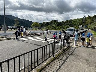こども園児と1、2年生は正しい横断歩道の渡り方を学びました。