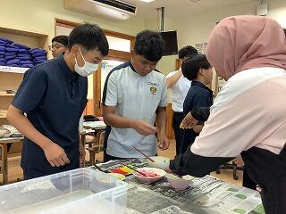 今年も県国際交流員のオン・ユーディンさん(シンガポール出身)を講師として招いて、国際理解講座を実施しました。5年生には、持参したスライドを使ってシンガポールの文化や観光地を紹介してくれました。7年生は、オンデ・オンデというシンガポールの伝統的なお菓子作りに挑戦しました。今回は、着色に使われるバンダンリーフの葉を取り寄せ、見た目も味も本物に近い仕上がりとなりました。