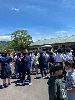 多くの児童生徒とともにバスを見送りました。