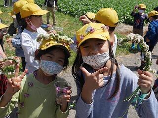 昨年、秋に蒔いたレンゲの種が春にこうやって見事に咲きほこりました。今日は地域の方々からレンゲの花やクローバの花で、花飾りや首飾りをつくる遊びを教えていただきました。今はこのように自然の中で自然とともに遊ぶことが少なくなってきたので、貴重な学びとなりました。種を提供していただいた大阪の方やレクチャーしていただいた地域の方々に感謝申し上げます。