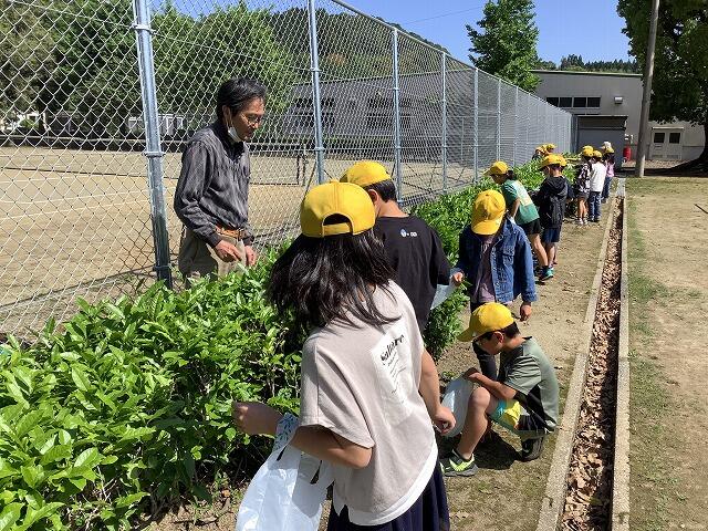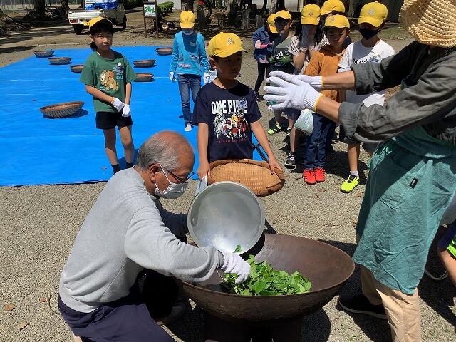 本校の校内には、グラウンドの隅にお茶の木が植えられています。毎年、3年生がそのお茶の葉を摘み、それを釜で煎ってよく揉んで、釜煎り茶づくりの体験学習に取り組んでいます。今年も地域支援ボランティアの植野さんに協力を依頼し、地域の方々に道具を持ち寄っていただき、体験学習を実施することができました。