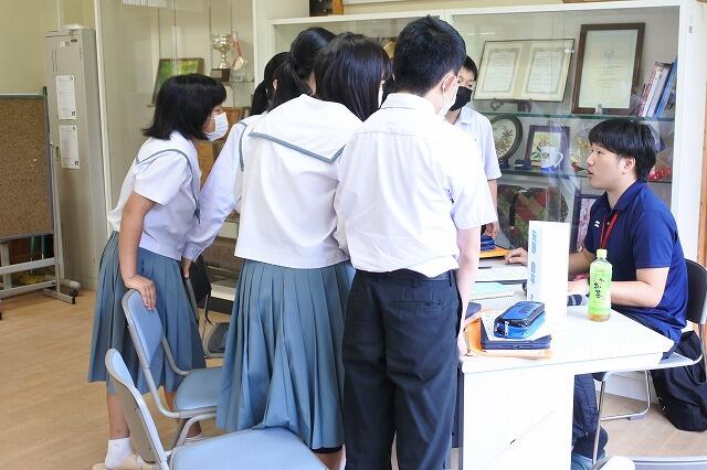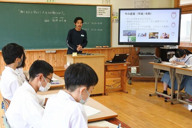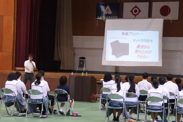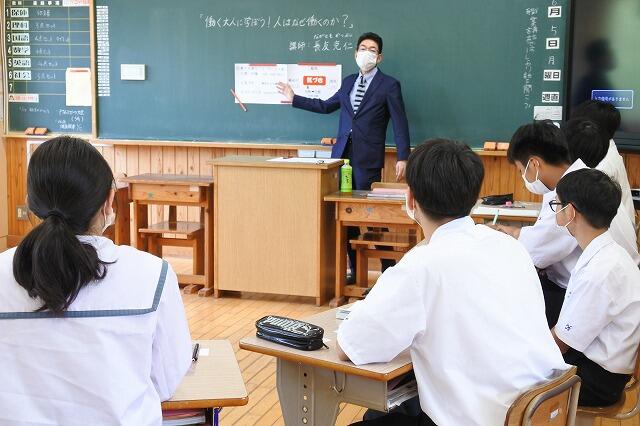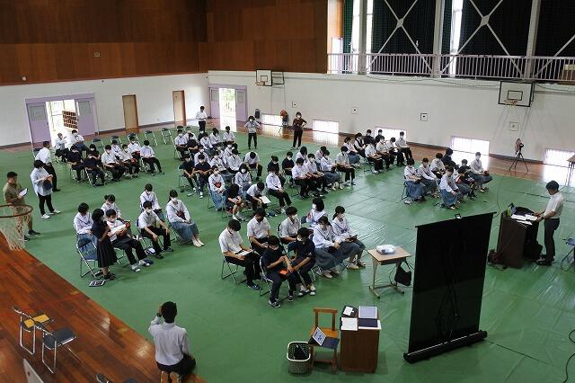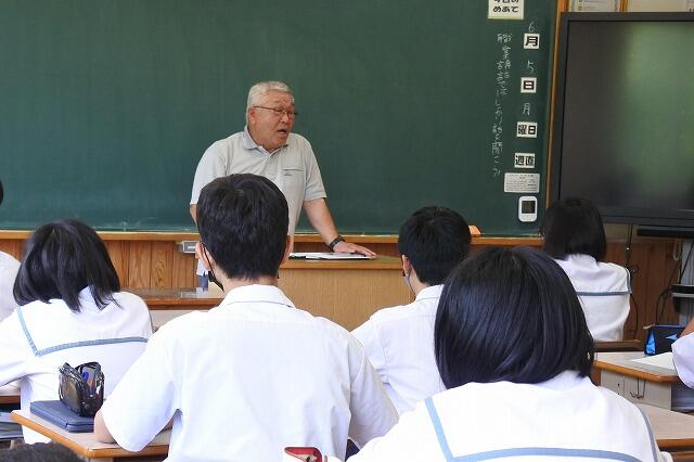 7月5日と6日の二日間、3年ぶりとなる職場体験学習(8年)を実施することになりました。その事前学習として、本日は講師の方をお招きし、「働く大人に学ぼう!~なぜ、人は働くのか~」と題して、職業講話を行っていただきました。今回、講師を引き受けてくださったのは、50年以上カツオ漁師をされていた栄松公民館館長の上牧様、日南山形屋取締役店長の長友様、北郷町のみなみ農園の福岡様でした。三方には、それぞれの職業について大変興味深い話をしていただき、生徒も熱心に聞き入っていました。