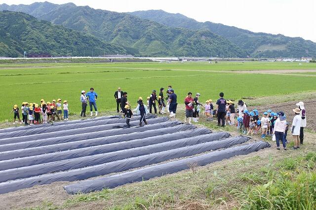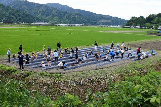 小学1・2年生と、こども園のぞう組さんが、駐車場横の畑で芋の苗植えを行いました。今年もJAはまゆうの青年部の方々に、畑の整地や苗の準備をしていただきました。そして今日は、植え方の手ほどきを受けながら、一緒に1本1本丁寧に植え付けていきました。昨年以上の豊作となるように、これから秋まで水やり等の世話をしていきます。