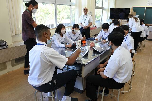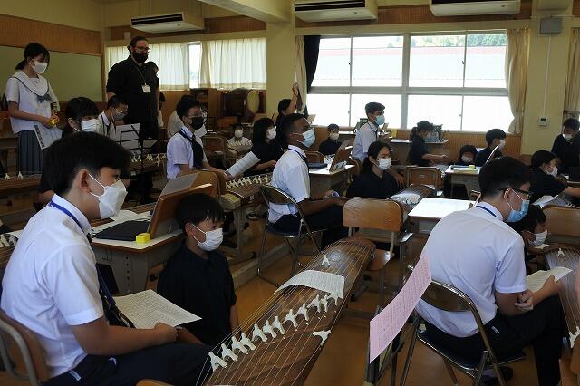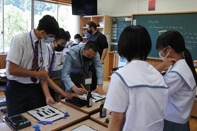 本校は、シンガポールのセント・ゲイブリエル中学校と姉妹校を盟約を結び、コロナ前は、毎年相互に1週間のホームスティを実施していました。今年度もそのホームスティは実施できませんでしたが、今日から3日間、リム校長先生と2名の先生方、そして10名の生徒が来校して、午前中の授業に参加しています。初日は、歓迎式の後、9年生と茶道、8年生と書道、7年生と琴の演奏といった日本の伝統文化の体験学習に取り組みました。