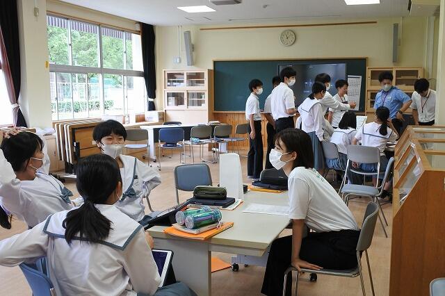 3年ぶりに全校生徒が体育館に集まり、生徒総会を実施しました。今年度は、3学年の枠を取り除いて9つのグループを編成し、事前討議に取り組みました。討議のテーマは「社会人に必要な資質とは?」と「中学生のうちにどのようなことに取り組めばいいか」とし、数回の討議を重ねてそれぞれ3つの内容にまとめました。そして本日の発表では、永野建設の永野伸弥社長にコメンテーターとして参加していただき、それぞれのグループの発表に関して、大変貴重なアドバイスをしていただきました。また、生徒の率直な質問にもわかりやすく返答していただき、生徒も真剣に聞き入っていました。