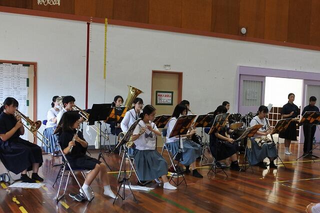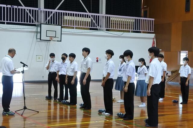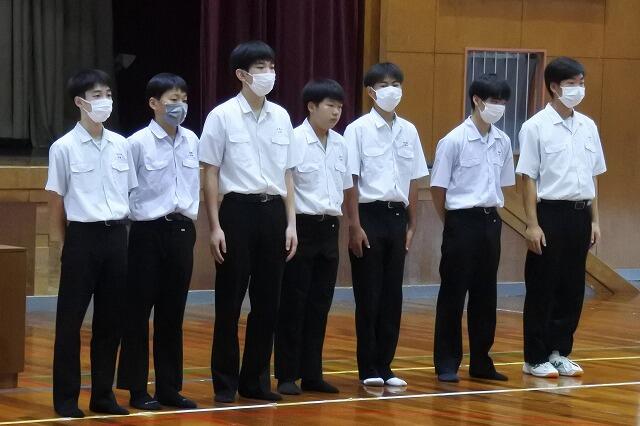 宮崎県中学校総合体育大会に、男子バレーボール部が地区代表として出場します。個人競技でも、ソフトテニスボール部の男女それぞれ1組が出場します。本日の壮行会では、それぞれの部のキャプテンが決意を述べ、学校長より激励のことばがありました。また、吹奏楽部も県の吹奏楽コンクールで発表する曲を披露してくれました。どの部活動も「北郷魂」を発揮して活躍してくれることを期待しています。