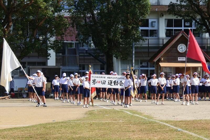 10月2日(日)に運動会を開催しました。当日は秋晴れの青空の下、小学部は、徒走とダンスと団技を、中学部は、学年リレーと団技を実施しました。どの競技でも赤白に分かれて熱戦を繰り広げましたが、特に中学部の団技は、4回の勝負では決着がつかず、9年生による代表決戦が行われました。また、小学部低学年白団の玉入れも圧巻でした。競技の最後は、1年生から9年生までによる全校リレーを実施し、大いに盛り上がりました。