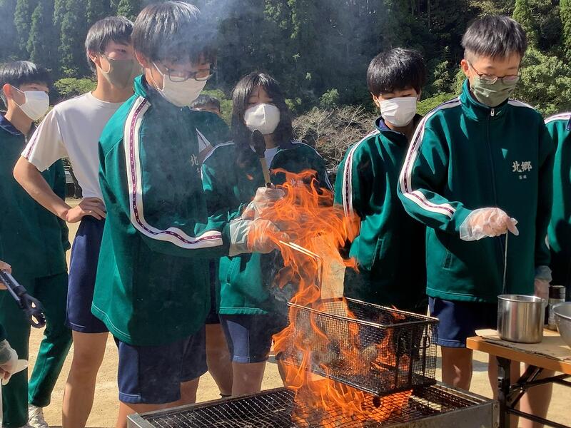 9年生の総合学習では、「道の駅北郷」の運営会社「ゴロウ商店」の協力を得て、商品開発の一端を体験させていただきながら、地域貢献の探究学習に取り組んでいます。本日は、11月の北郷産業祭りで販売予定の、鰹の炭火焼きに挑戦させていただきました。炭火で焼くと、藁の強火で表面を焼いた鰹のタタキとは全く違った風味となり、一食の価値ありです。当日は9年生も売り子として参加する予定ですので、是非立ち寄って試食していただければと思います。