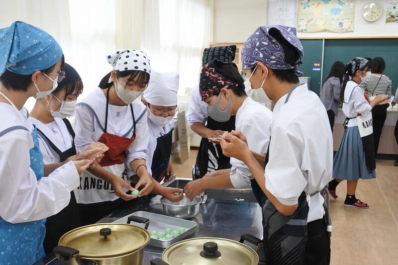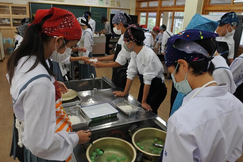宮崎県の国際交流員として8月にシンガポールから来日した、オン・ユーディンさんを講師として招いて、7年生に国際理解講座を実施してもらいました。前半はシンガポールに関する紹介があり、後半は、シンガポールで人気のおやつ(オンデ・オンデ)作りに挑戦しました。作り方は日本の白玉団子に似ていましたが、香り付けや色付けを行い、仕上げにココナッツをまぶした手の込んだおやつで、とても美味しく出来上がりました。