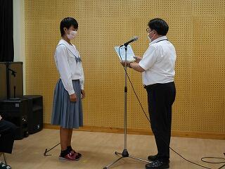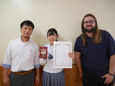 9月28日に南那珂地区英語暗唱弁論大会が行われました。そこで「弁論の部」で優秀賞を貝崎なずなさんが受賞しました。良く頑張りましたね!ご指導いただいたALTの先生や英語科の先生にも感謝し、今後も努力してくださいね。