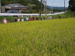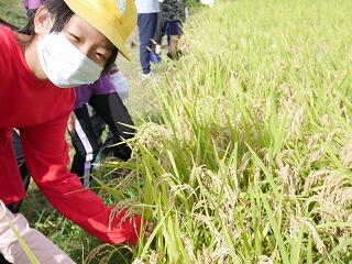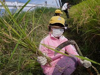 長く暑かった夏も今朝になり、ようやく秋を感じる涼しさになりました。6月に田植えをした稲が、まさに「黄金色」の稲穂となり、今日、稲刈りをむかえることができました。自然豊かな町で育った「北郷っ子」も稲刈りをした児童はほんのわずかです。そこでJAはまゆう青年部の方々のご指導をいただき、稲刈り体験学習をすることができました。お忙しい中、本当にありがとうございました。収穫したお米は12月に餅つき体験をしたあと、美味しくいただきます。また、販売もいたしますので、よろしくお願いします。