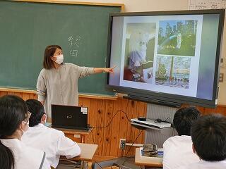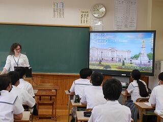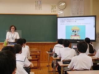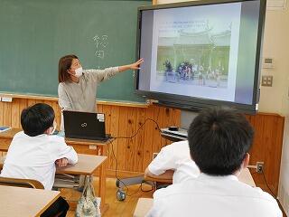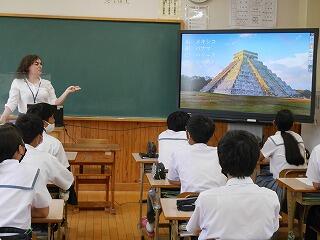 本日、8・9年(中学2・3年)の英語の授業において、日南市国際交流員のケイト先生を講師としてお招きし、国際理解講座を行いました。先生はフロリダ州育ちのアメリカ人です。祖父がスウエーデン人で祖母はメキシコ人と国際色豊かな家庭で育ったことで、大学時に中国に留学し、大学卒業後は名古屋で過ごし、現在の日南市国際交流員になったということでした。先生の様々な国での経験談を聞くたびに生徒たちは目を輝かせていました。
