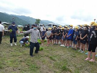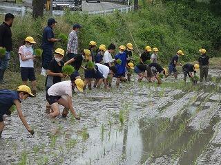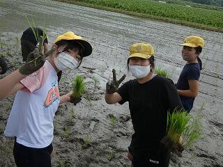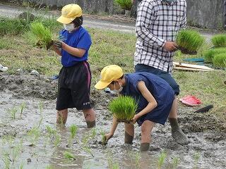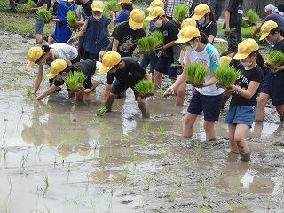 今日は天候が気になりましたが、暑すぎず「田植え」をするには最高の日となりました。JAはまゆう青年部の皆さんを講師として、5年生23名と中学生も参加して、泥んこになりながら楽しそうに田植えを体験しました。家でお手伝いをしているという児童は慣れた手つきでスムーズに前へ前へと進んでいました。この稲が秋には豊かな実りとなり、「稲刈り」「餅つき体験」ができるように願っています。また、地域の方にも販売しますので購入をよろしくお願いいたします。
