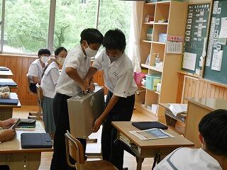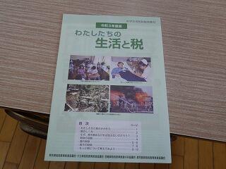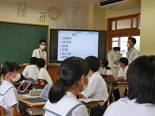 本校は4月に租税教育の委嘱校の指定を受けました。本日は税務署の方が講師として、8年生(中学2年生)に租税教室を提供していただき、税金の種類や使い道・役割について学びました。また1億円の重さを体験する場面もあり、これから1年間、楽しみながら学習していきたいです。
