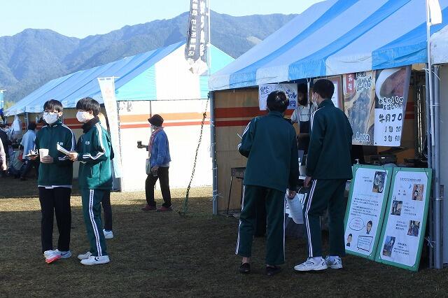 週末に大藤河川敷で行われた北郷産業祭りで、ゴロウ商店が商品開発した肉鰹の炭火焼き販売に、9年生がボランティアで参加しました。生徒は、材料の下ごしらえの手伝いの他、自作のプロモーションビデオを流したり、来場者に自前のチラシを配ったりして集客活動に取り組んでいました。また、吹奏楽部も1,2年生の新体制となって初めての演奏を披露して、会場の注目を集めていました。