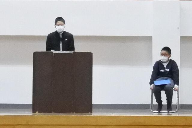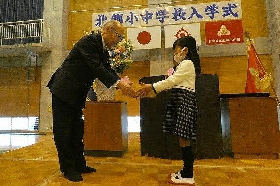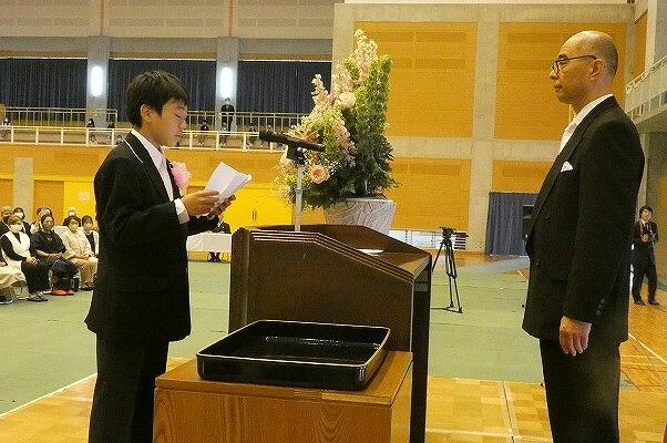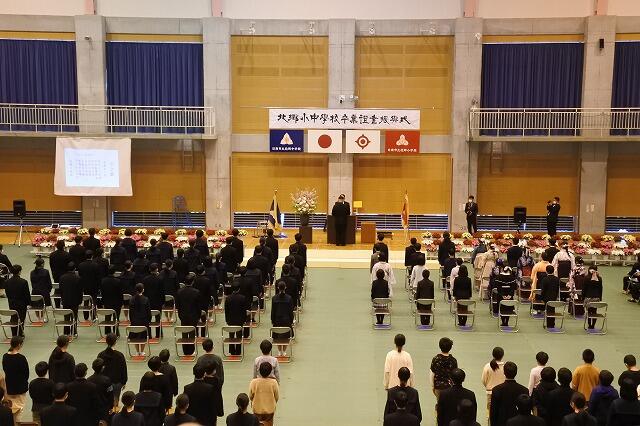 本年度は、新1年生20名と新7年生の23名が、吹奏楽部の演奏に迎えられて、仲良く手をつないで入場してきました。式では、元気よく氏名点呼の返事を行い、それぞれの学年の代表が誓いのことばを述べました。また学校運営協議会の委員の方々を来賓としてお迎えし、教育委員会の告辞や記念品の贈呈、全児童生徒による学園歌の斉唱もありました。少しずつではありますが、今年度の学校行事はコロナ以前の内容に戻り始めました。
