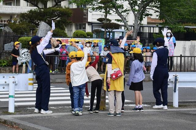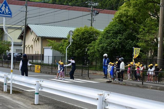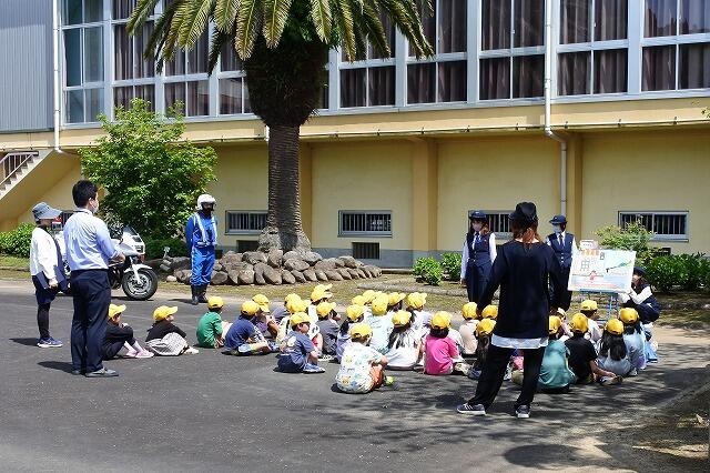 日南警察署と日南地区交通安全指導員の方々に講師として来ていただき、交通安全教室を実施しました。今回は、こども園の園児と1・2・3年生には実際に正門前の横断歩道で、安全な渡り方の指導をしていただきました。ドライバーの方々も、横断歩道付近に子どもがいたら急な飛び出しに用心して、徐行運転をお願いいたします。