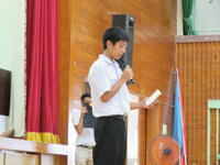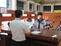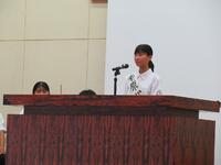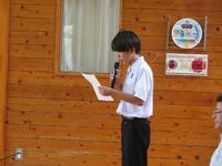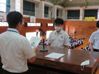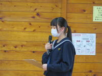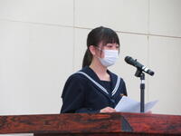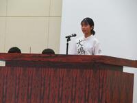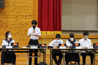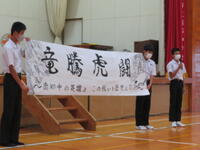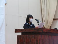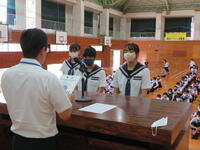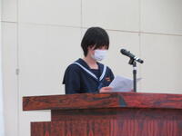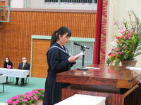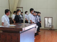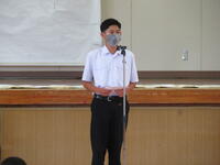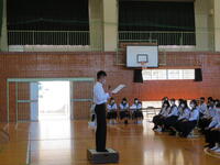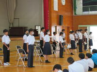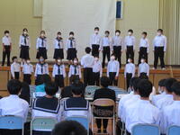 地区中学校秋季体育大会が今週末に迫り、県大会に出場する水泳競技と合わせて推戴式がおこなわれました。まず、各部、クラブから大会にかける意気込み、これまで指導や応援をしてくださった方々への感謝の気持ちなどが述べられました。男子ソフトテニス部の主将が代表で宣誓し、選手一同、より気持ちが引き締まったことと思います。校長先生から激励の言葉が送られた後、全校生徒で校歌を歌いました。全員が心をひとつに一生懸命歌い、特に3年生の歌声からは、後輩たちを後押しする強い思いが感じられました。きっと選手たちにも伝わったことでしょう。
