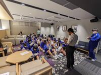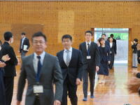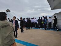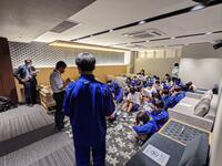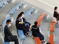 機材遅延のため離陸が20分遅れ、宮崎空港に7時10分に到着しました。この後空港ロビーで、修学旅行の解散式を行います。