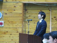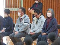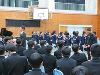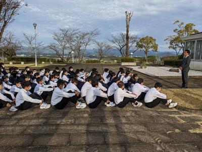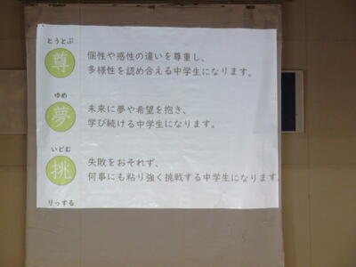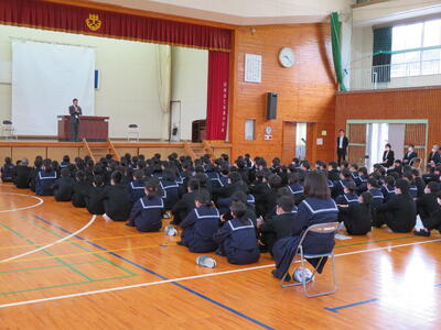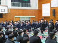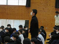 校長先生からは、「2学期に見られた集団としての成長を生かすには、生徒1人1人のレベルアップが必要であること」、「目標を立てることが大事だが、その目標が形だけで終わってしまうのではなく、スモールステップをきっかけに自信を付けていくことが大切であること」など、サッカー日本代表の堂安選手の話を例にあげて話がありました。