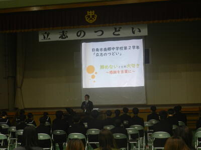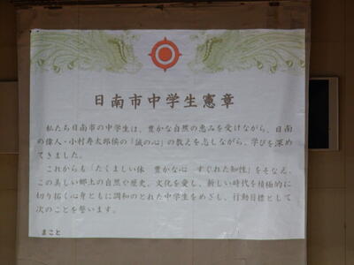 11月8日(火)の集会の時間では、まず県中学校秋季体育大会水泳競技において、個人2種目で入賞を果たした生徒の表彰がおこなわれました。200Mと400Mの自由形で2位という、素晴らしい成績を納めました。翌日の日南市音楽大会に参加する3年2組に「激励の言葉」が送られ、課題曲と自由曲の披露がありました。とても深みのある歌声で、合唱コンクール時よりもさらにグレードアップしていました。音楽大会が3年2組の皆さんにとって、素晴らしい思い出になることを祈っています。
