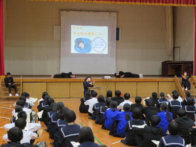 「性教育」は「人権教育」であり、「防災教育」であり、自分や周りの人を守るための「知識のお守り」であるというお話から始まりました。そして、思春期にいる中学生は、ネガティブな感情を受け取る感覚が敏感になっている。その他、脳の発達やSNSトラブル、性的同意についてお話しくださり、「性」についての正しい知識を伝えてくださいました。また、ザワザワする気持ちを抑える方法として「瞑想」を紹介されました。そして、1番大切なことは、どんなことでも困ったことがあったら、心の傷が深くなる前に一人で抱え込まず、信頼できる大人へすぐに相談するよう話がありました。