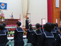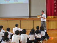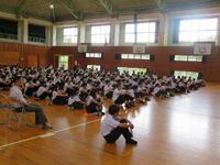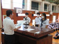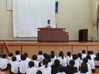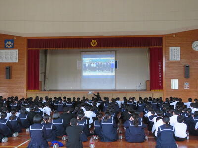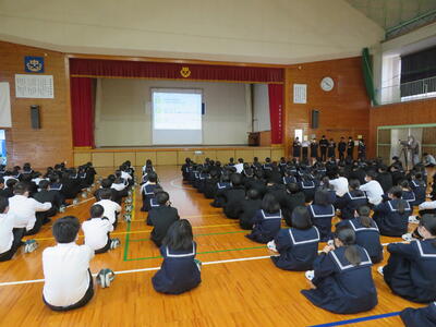 10月25日(火)の集会の時間に、県大会の推戴式がおこなわれました。今回県大会に出場する女子バレーボール部、男女ソフトテニス個人ペア、弓道部女子団体と個人、そしてバドミントンクラブペアの各代表選手から抱負が述べられ、女子バレーボール部主将が選手代表宣誓をおこないました。教頭先生の話は自分たちがこれまで誰のために練習を頑張ってきたのかを思い出させることから始まり、その方々をもっと喜ばせよう、そういう思いで大会までの残りの時間を有意義に過ごしてほしいとの内容でした。