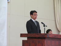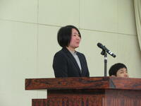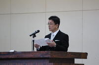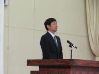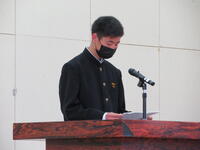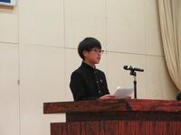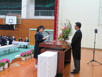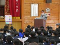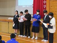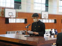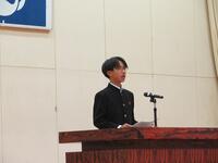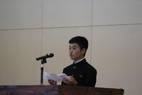 終業式ではまず、各学年・生徒会代表の生徒たちが、2学期を振り返って反省を発表してくれました。「地域のゴミ拾いや日々の宅習では、全員が意識すれば変わることを実感した。」、「体育大会や文化発表会では、1つの目標に向かってみんなで力を合わせながらまとめることができ、納得感が味わえた。」、「文化発表会では、合唱に対する意識が高まり、その成果を披露することができた。」、「気づきや学びの多い2学期で、協力・協働の大切さを学ぶことができた。」など、4名とも、とても堂々とした態度で発表してくれました。