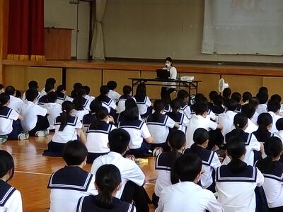 10月14日(火)に、第2回家庭教育学級・学校保健委員会を実施しました。今回は、インクルーシブ・ラボの坂本麻季子先生をお招きして、「思春期に伝えたい包括的性教育」と題して講演会を行い、全学年の生徒と16名の保護者の皆様で聞きました。