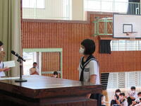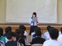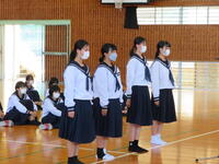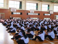 10月25日(火)の集会の時間に、県大会の推戴式がおこなわれました。今回県大会に出場する女子バレーボール部、男女ソフトテニス個人ペア、弓道部女子団体と個人、そしてバドミントンクラブペアの各代表選手から抱負が述べられ、女子バレーボール部主将が選手代表宣誓をおこないました。教頭先生の話は自分たちがこれまで誰のために練習を頑張ってきたのかを思い出させることから始まり、その方々をもっと喜ばせよう、そういう思いで大会までの残りの時間を有意義に過ごしてほしいとの内容でした。