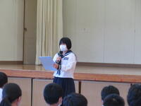 終業式ではまず、各学年・生徒会代表の生徒たちが、2学期を振り返って反省を発表してくれました。「地域のゴミ拾いや日々の宅習では、全員が意識すれば変わることを実感した。」、「体育大会や文化発表会では、1つの目標に向かってみんなで力を合わせながらまとめることができ、納得感が味わえた。」、「文化発表会では、合唱に対する意識が高まり、その成果を披露することができた。」、「気づきや学びの多い2学期で、協力・協働の大切さを学ぶことができた。」など、4名とも、とても堂々とした態度で発表してくれました。