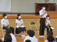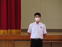地区中学校秋季体育大会が今週末に迫り、県大会に出場する水泳競技と合わせて推戴式がおこなわれました。まず、各部、クラブから大会にかける意気込み、これまで指導や応援をしてくださった方々への感謝の気持ちなどが述べられました。男子ソフトテニス部の主将が代表で宣誓し、選手一同、より気持ちが引き締まったことと思います。校長先生から激励の言葉が送られた後、全校生徒で校歌を歌いました。全員が心をひとつに一生懸命歌い、特に3年生の歌声からは、後輩たちを後押しする強い思いが感じられました。きっと選手たちにも伝わったことでしょう。