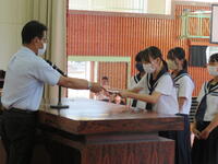 4月18日(火)5校時、1年生を対象に交通安全教室を行いました。日南警察署、日南市交通安全協会から講師の方々を迎え、講話や自転車点検、実技指導等をしていただきました。自転車の実技指導では、安全を確認しながら、グランドに準備したコースを回りました。確認箇所が多くて大変だったでしょうが、安全に公道を通行するためには、それだけ注意が必要であるということに気付けたかと思います。ここで学んだことを生かし、交通安全を心掛けていきましょう。