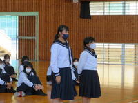 11月8日(火)の集会の時間では、まず県中学校秋季体育大会水泳競技において、個人2種目で入賞を果たした生徒の表彰がおこなわれました。200Mと400Mの自由形で2位という、素晴らしい成績を納めました。翌日の日南市音楽大会に参加する3年2組に「激励の言葉」が送られ、課題曲と自由曲の披露がありました。とても深みのある歌声で、合唱コンクール時よりもさらにグレードアップしていました。音楽大会が3年2組の皆さんにとって、素晴らしい思い出になることを祈っています。