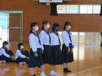 10月25日(火)の集会の時間に、県大会の推戴式がおこなわれました。今回県大会に出場する女子バレーボール部、男女ソフトテニス個人ペア、弓道部女子団体と個人、そしてバドミントンクラブペアの各代表選手から抱負が述べられ、女子バレーボール部主将が選手代表宣誓をおこないました。教頭先生の話は自分たちがこれまで誰のために練習を頑張ってきたのかを思い出させることから始まり、その方々をもっと喜ばせよう、そういう思いで大会までの残りの時間を有意義に過ごしてほしいとの内容でした。