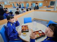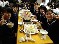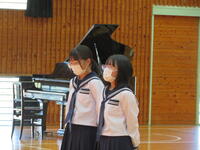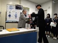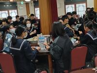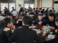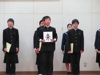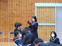 2月9日(金)5、6校時、2年生の「立志のつどい」が行われました。実行委員が中心となって、当日までの準備や当日の会場設営、進行に取り組みました。立志のつどいは、校長先生による「夢叶う」、「奇跡」などの花言葉を有した青いバラの紹介から始まりました。2年生による決意表明では、1人1人が漢字一文字を書いた色紙を掲げ、これから成し遂げたいことを発表していきました。前半終わりには、お祝いに地域コーディネーターの矢野さんと食育ボランティアの方々から手作りちらし寿司の贈呈がありました。